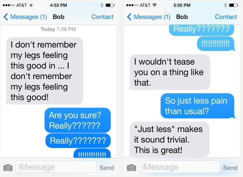 Then, two days ago, on the 12th day, I was at home when I received a text message from Bob saying that he could never remember a time when his legs felt so good. I was flabbergasted and immediately texted back and asked for more details and confirmation. He wrote back saying that he felt great and he wasn’t kidding me. At which point I picked up the phone and called him at work (something I normally don’t do because he’s so busy), but this was important.