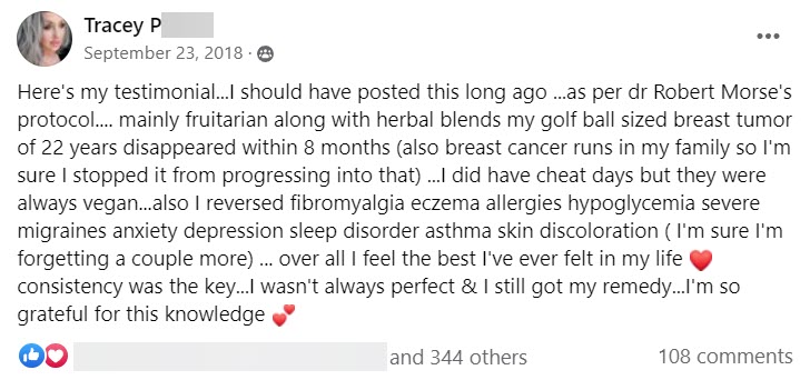 Here's my testimonial...I should have posted this long ago ...as per dr Robert Morse's protocol.... mainly fruitarian along with herbal blends my golf ball sized breast tumor of 22 years disappeared within 8 months (also breast cancer runs in my family so I'm sure I stopped it from progressing into that) ...I did have cheat days but they were always vegan...also I reversed fibromyalgia eczema allergies hypoglycemia severe migraines anxiety depression sleep disorder asthma skin discoloration ( I'm sure I'm forgetting a couple more) ... over all I feel the best I've ever felt in my life