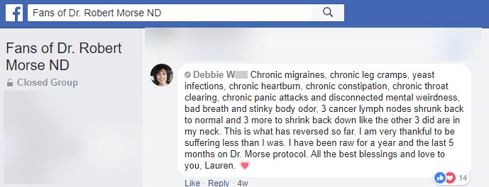 Chronic migraines, chronic leg cramps, yeast infections, chronic heartburn, chronic constipation, chronic throat clearing, chronic panic attacks and disconnected mental weirdness, bad breath and stinky body odor, 3 cancer lymph nodes shrunk back to normal and 3 more to shrink back down like the other 3 did are in my neck.