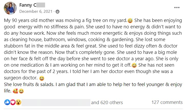 She has been enjoying good energy with no stiffness & pain. She used to have no energy & didn't want to do any house work. Now she feels much more energetic & enjoys doing things such as cleaning house, bathroom, windows, cooking & gardening. She lost some stubborn fat in the middle area & feel great. She used to feel dizzy often & doctor didn't know the reason. Now that's completely gone. She used to have a big mole on her face & felt off the day before she went to see doctor a year ago. She is only on one medication & I am working on her mind to get it off.