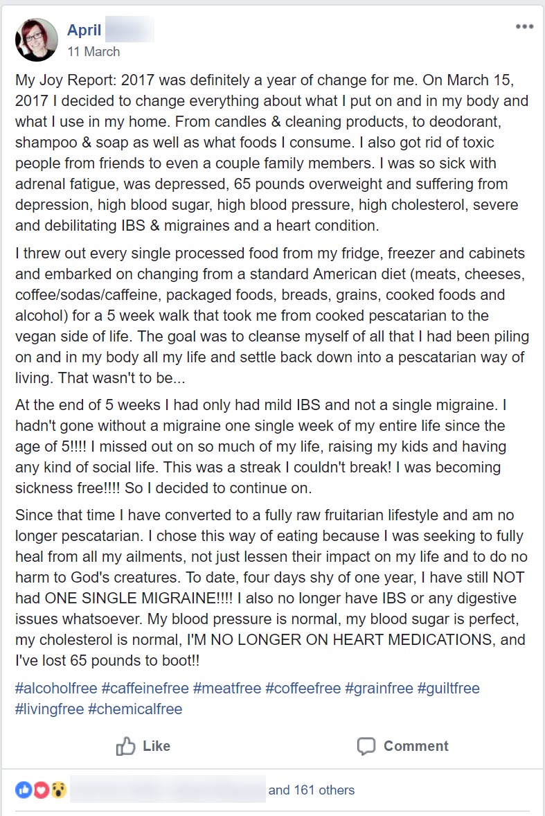 Since that time I have converted to a fully raw fruitarian lifestyle and am no longer pescatarian. I chose this way of eating because I was seeking to fully heal from all my ailments, not just lessen their impact on my life and to do no harm to God’s creatures. To date, four days shy of one year, I have still NOT had ONE SINGLE MIGRAINE!!!! I also no longer have IBS or any digestive issues whatsoever. My blood pressure is normal, my blood sugar is perfect, my cholesterol is normal, I’M NO LONGER ON HEART MEDICATIONS, and I’ve lost 65 pounds to boot!!