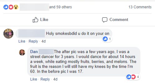 The after pic was a few years ago, I was a street dancer for 3 years. I would dance for about 14 hours a week, while eating mostly fruits, berries, and melons. The fruit is the reason I will still have my knees by the time I’m 60. In the before pic I was 17.